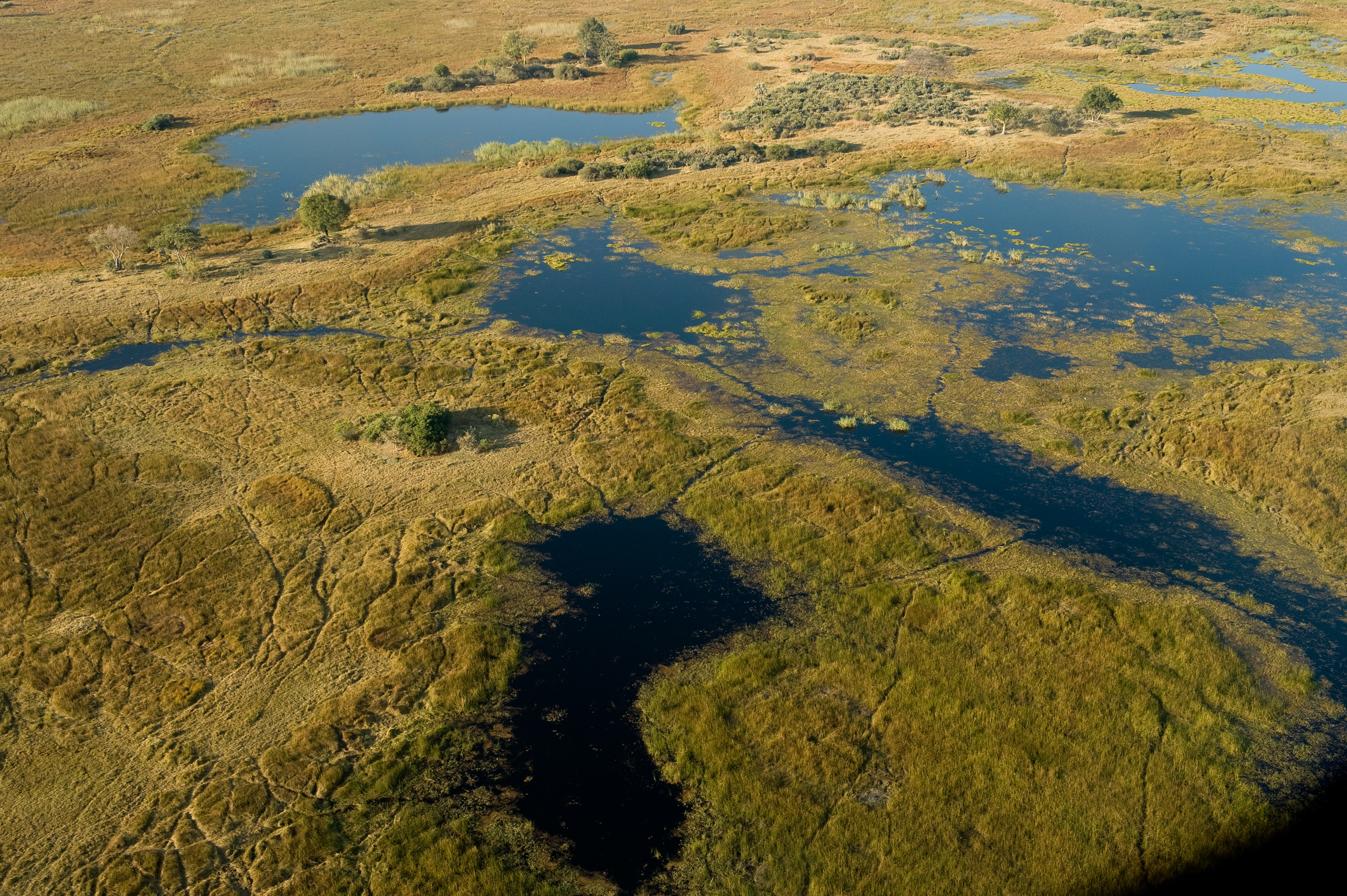 Valtava Okavangojoki valuu hiekkaerämaahan, joka on käytännössä osa Kalaharia. Tämä lähes 16 000 km2:n suuruinen alue on sekoitus savanneja ja metsiä, joita kirkasvetiset vesistöt pilkkovat laguuneiksi ja saariksi. Vaikka veden määrä vaihtelee, vettä on ainakin osassa Okavangoa ympäri vuoden. Sen vuoksi alueella on aina myös laaja kirjo eläimiä antiloopeista kissapetoihin ja norsuista krokotiileihin.